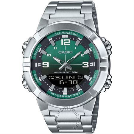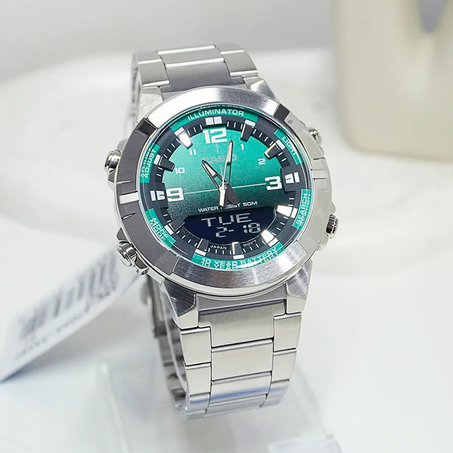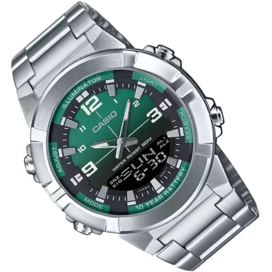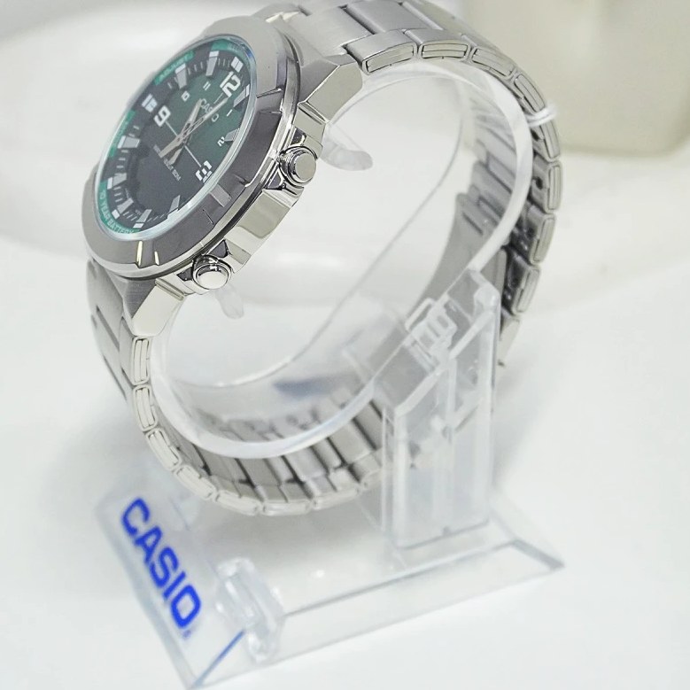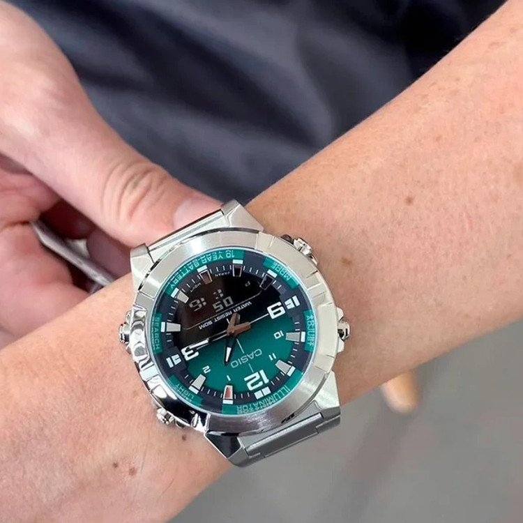 ساعت مچی مردانه کاسیو AMW-870DA-3AV یکی از مدلهای برجسته و کاربردی برند کاسیو است که با طراحی خاص، ترکیبی از استایل کلاسیک و ورزشی را ارائه میدهد و برای افرادی که به دنبال ساعتی چندمنظوره، مقاوم و زیبا هستند، گزینهای بینظیر به شمار میرود. این ساعت با ظاهر جذاب و ساختار دقیق خود توانسته جایگاه ویژهای میان ساعتهای مردانه کلاسیک-ورزشی داشته باشد و در استفادههای روزمره یا رسمی عملکرد قابل توجهی ارائه دهد.ساعت دارای ۲۱ممطقه زمانی و کرنومتر شمارش معکوس ۲۴ساعته،۳آلارم روزانه LEDکهربایی و دارای حافظه ۳۰مجموعه ۸کارکتری نامو ۱۶رقمی شماره تلفن و عقربه های شب نما میباشد. طراحی ظاهری این مدل بهگونهای انجام شده که هم زیبایی بصری و هم کارایی مطلوب را در کنار هم قرار دهد. صفحه آنالوگ ساعت با رنگ سبز جذاب و نشانگرهای واضح، امکان مشاهده زمان را بهصورت سریع و دقیق فراهم میکند. عقربهها و نشانگرهای برجسته باعث میشوند اطلاعات زمان بهوضوح قابل خواندن باشند، حتی در نور کم. طراحی صفحه با جزئیات دقیق باعث شده این مدل برای استفاده در موقعیتهای مختلف، از فعالیتهای روزمره گرفته تا محیطهای کاری و جلسات رسمی مناسب باشد.