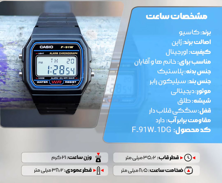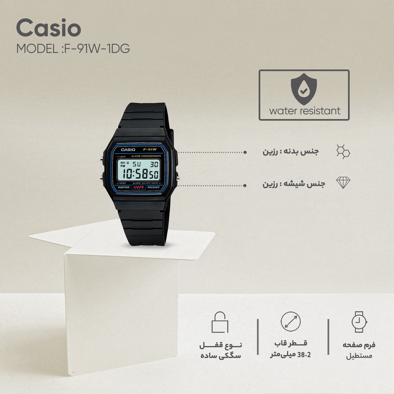 ساعت مردانه و زنانه کاسیو Casio مدل F-91W-1DG یک ساعت بسیار زیبا و اسپرت است. هدف کمپانی کاسیو Casio عرضه ساعتی ارزان قیمت در عین حال با کیفیت که همراه دائمی شما باشد. تکنولوژی موتور این ساعت ژاپنی، دیجیتالی است که موجب شده دقت این ساعت بسیار بالا باشد، همچنین در ساخت بند و قاب این ساعت از مواد اولیه مرغوب استفاده شده که دوام بالا در برابر خط و خش و ضربه را برای این ساعت به ارمغان می آورد.